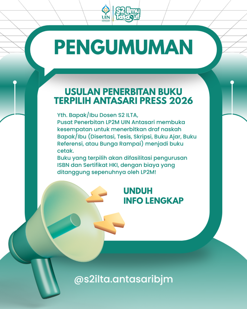 Dalam rangka mendukung publikasi ilmiah civitas akademika, Pusat Penerbitan, Rumah Jurnal, dan HKI LP2M UIN Antasari Banjarmasin membuka kesempatan bantuan penerbitan buku cetak (Program Buku Terpilih Antasari Press Tahun 2026).